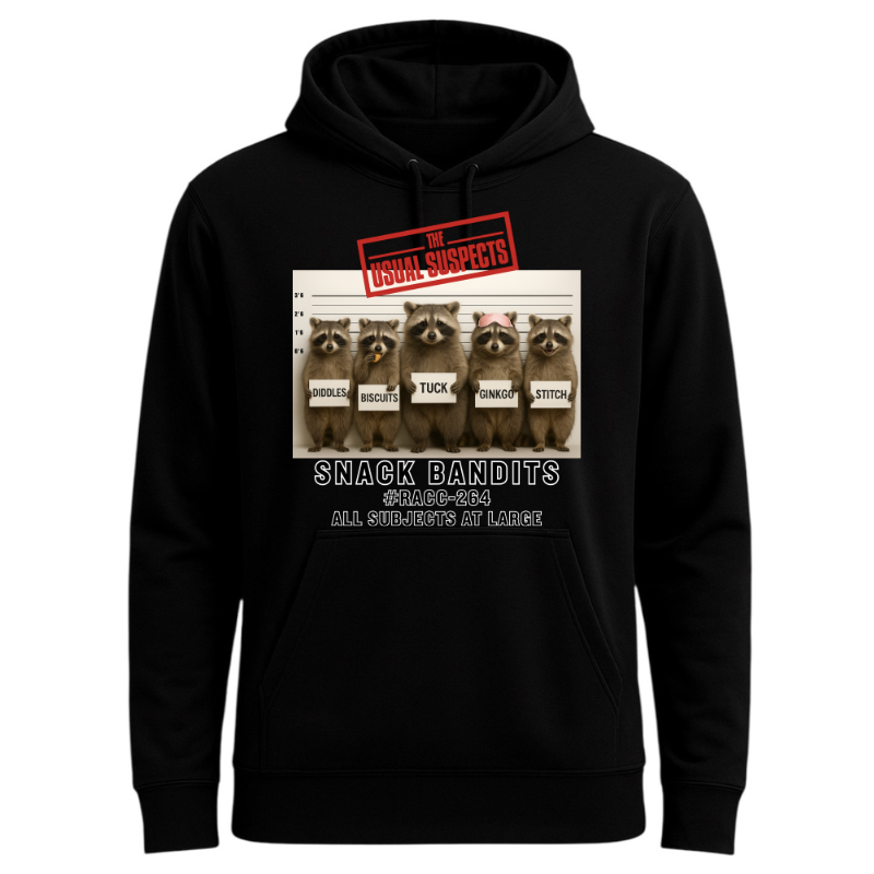 Snack Bandits Raccoon Hoodie – Unisex Black Pullover Graphic Hoodie | 32° Cooltech Performance Fabric